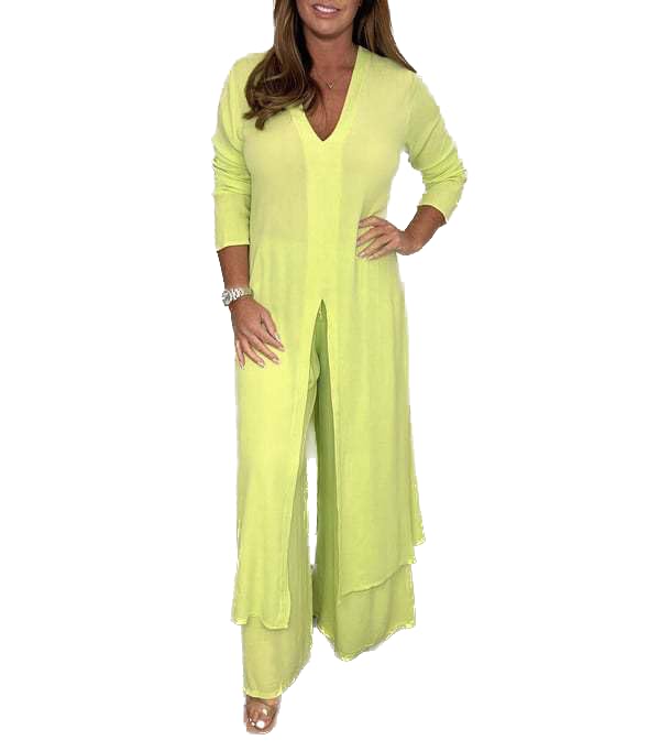 Diseñado para el día a día así como para ocasiones formales, es ligero y cómodo, permitiéndote usarlo en multitud de ocasiones. Gracias a su tejido de algodón y poliéster de primera calidad, se adapta a la perfección a cualquier figura y su cuidado es sencillo, por lo que seguirá como nuevo después de cada lavado. Su top largo con escote de pico junto con su pantalón ancho, lo convierten en una opción elegante y fácil de llevar, ayudándote a mantener tu estilo propio. Lo mejor de este conjunto es su versatilidad, ya que puedes usar el top largo y los pantalones anchos juntos o combinarlos por separado con otros prendas.