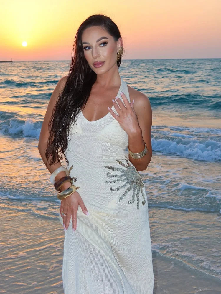 Naturalmente deslumbrante. Este vestido largo de punto en blanco roto abraza la silueta con suavidad y ligereza, ofreciendo una estética fresca, relajada y femenina.