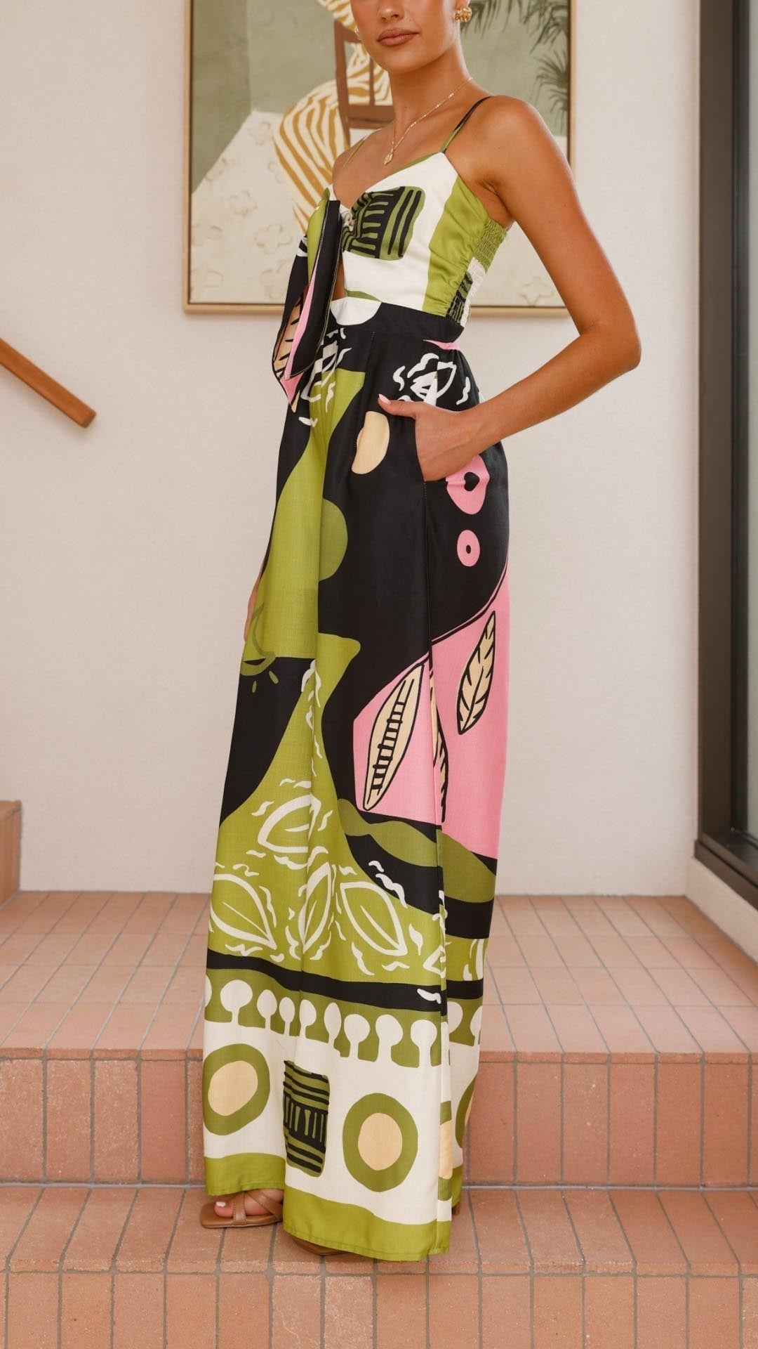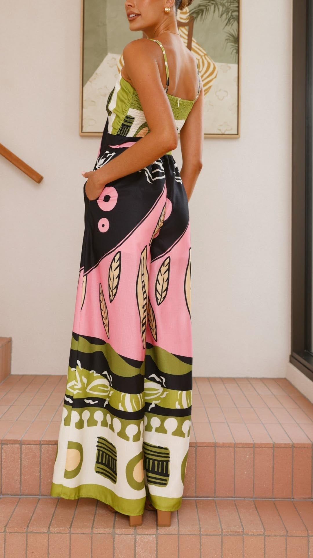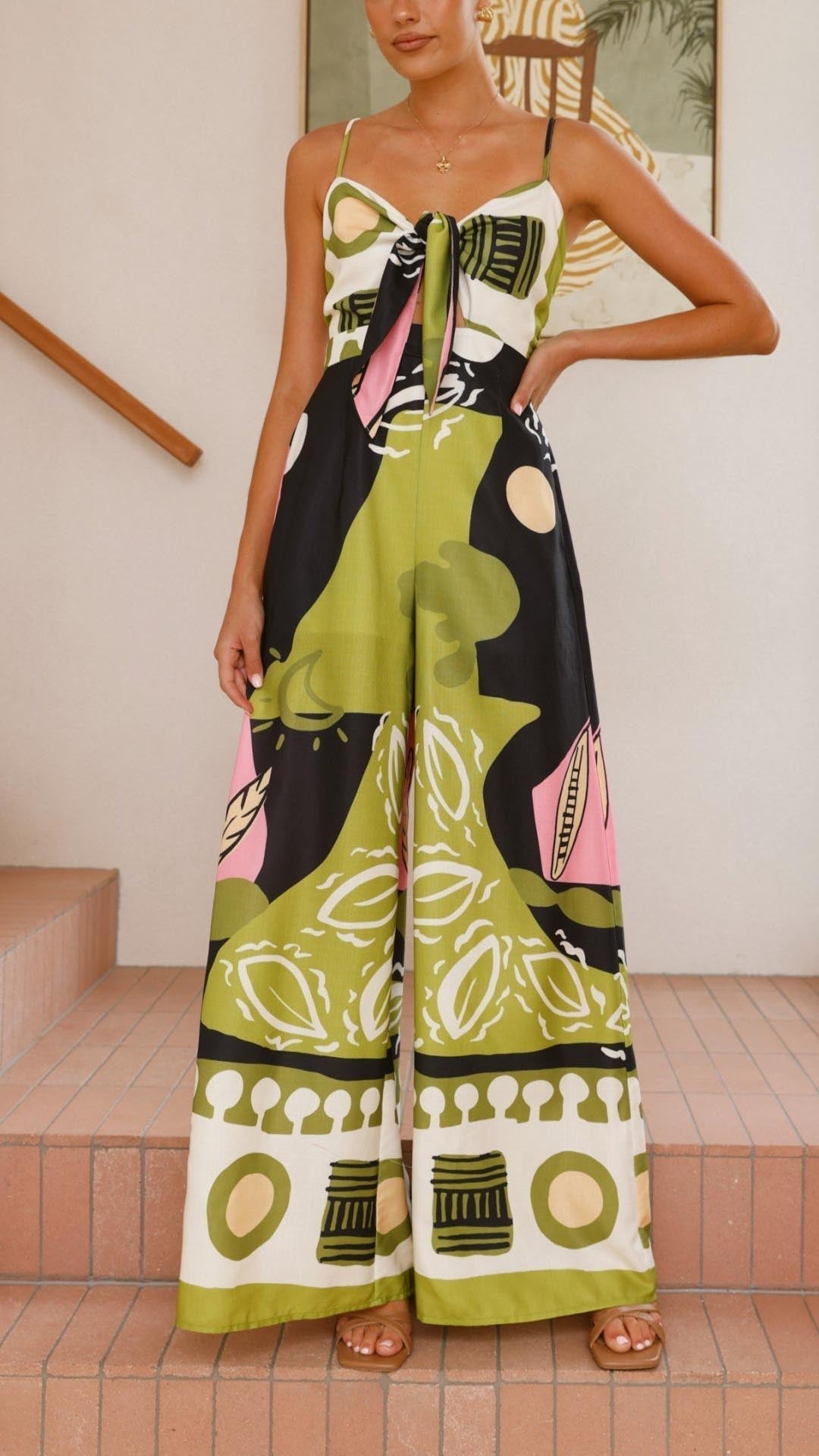 Este mono presenta un corte ancho que aporta comodidad y libertad de movimientos. Además, su tejido de suave algodón y poliéster se adapta a la perfección a cualquier cuerpo, resaltando tus curvas y tu figura de manera favorecedora. Su original estampado le da un toque moderno y sus bolsillos laterales lo hacen práctico y versátil. Su cierre frontal con un nudo le brinda sensualidad a tu look, para que te sientas más sexy si cabe cada vez que lo vistas.