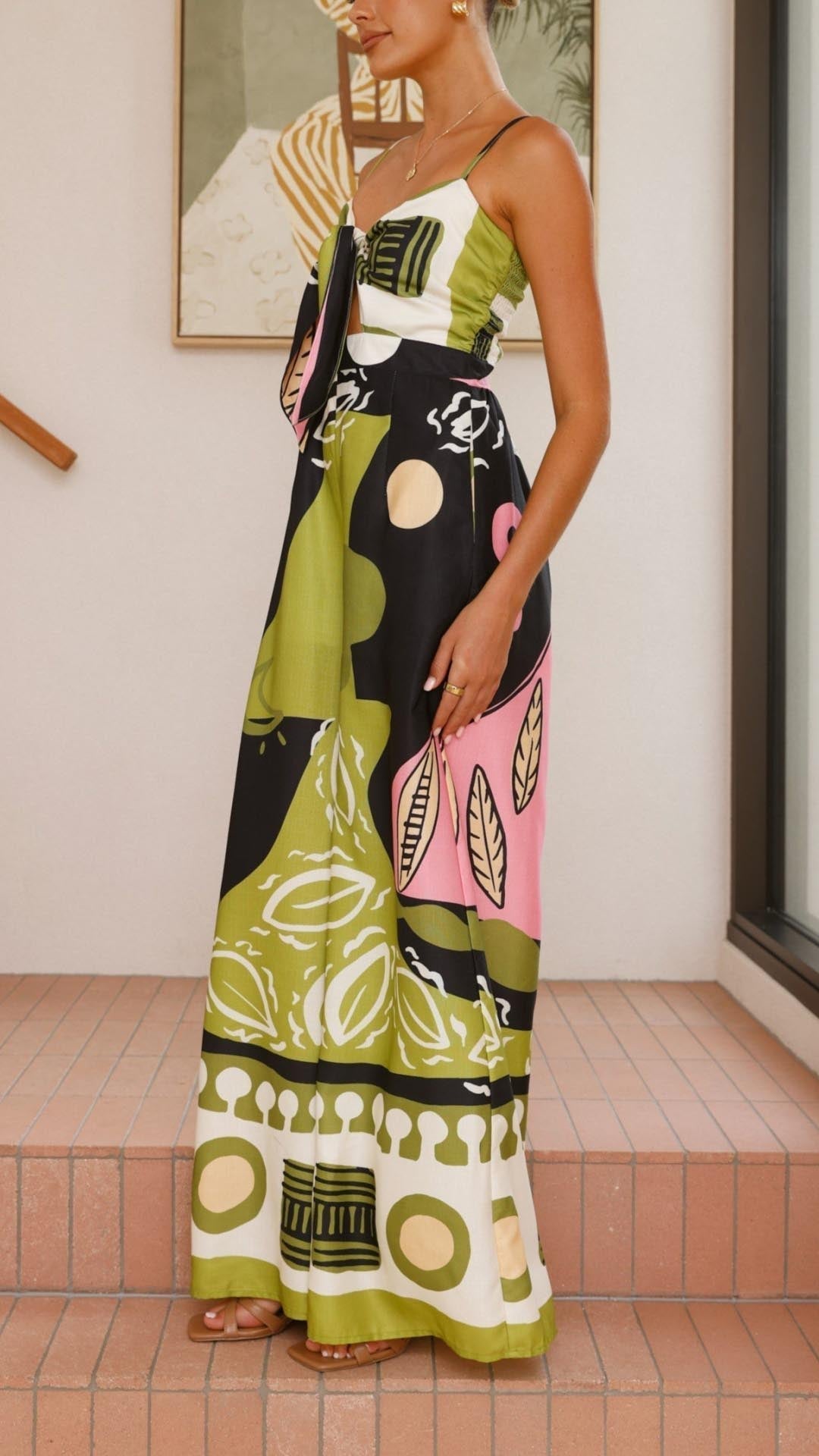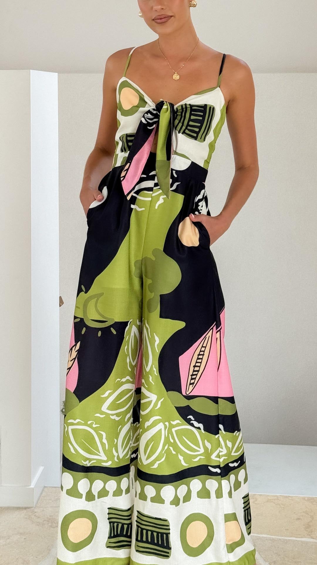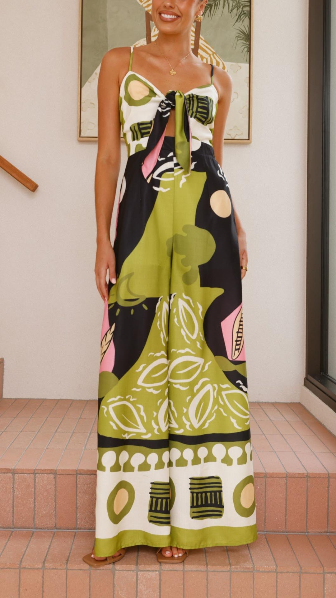 Este mono presenta un corte ancho que aporta comodidad y libertad de movimientos. Además, su tejido de suave algodón y poliéster se adapta a la perfección a cualquier cuerpo, resaltando tus curvas y tu figura de manera favorecedora. Su original estampado le da un toque moderno y sus bolsillos laterales lo hacen práctico y versátil. Su cierre frontal con un nudo le brinda sensualidad a tu look, para que te sientas más sexy si cabe cada vez que lo vistas.