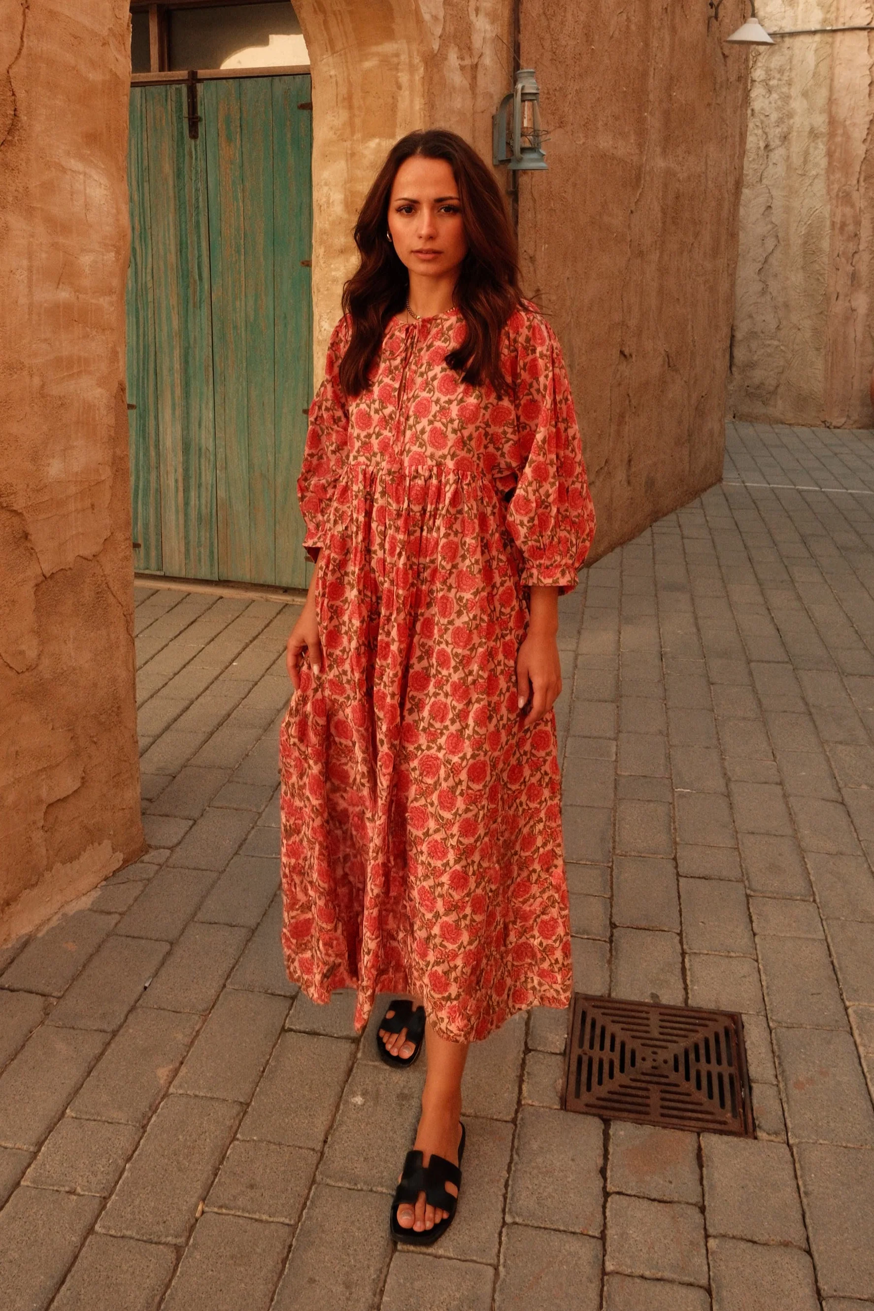 Ligereza que abraza el movimiento. Este vestido largo de corte amplio y mangas abullonadas evoca un estilo bohemio refinado, con estampado floral en tonos rojizos que capturan la energía del verano con calidez y carácter.