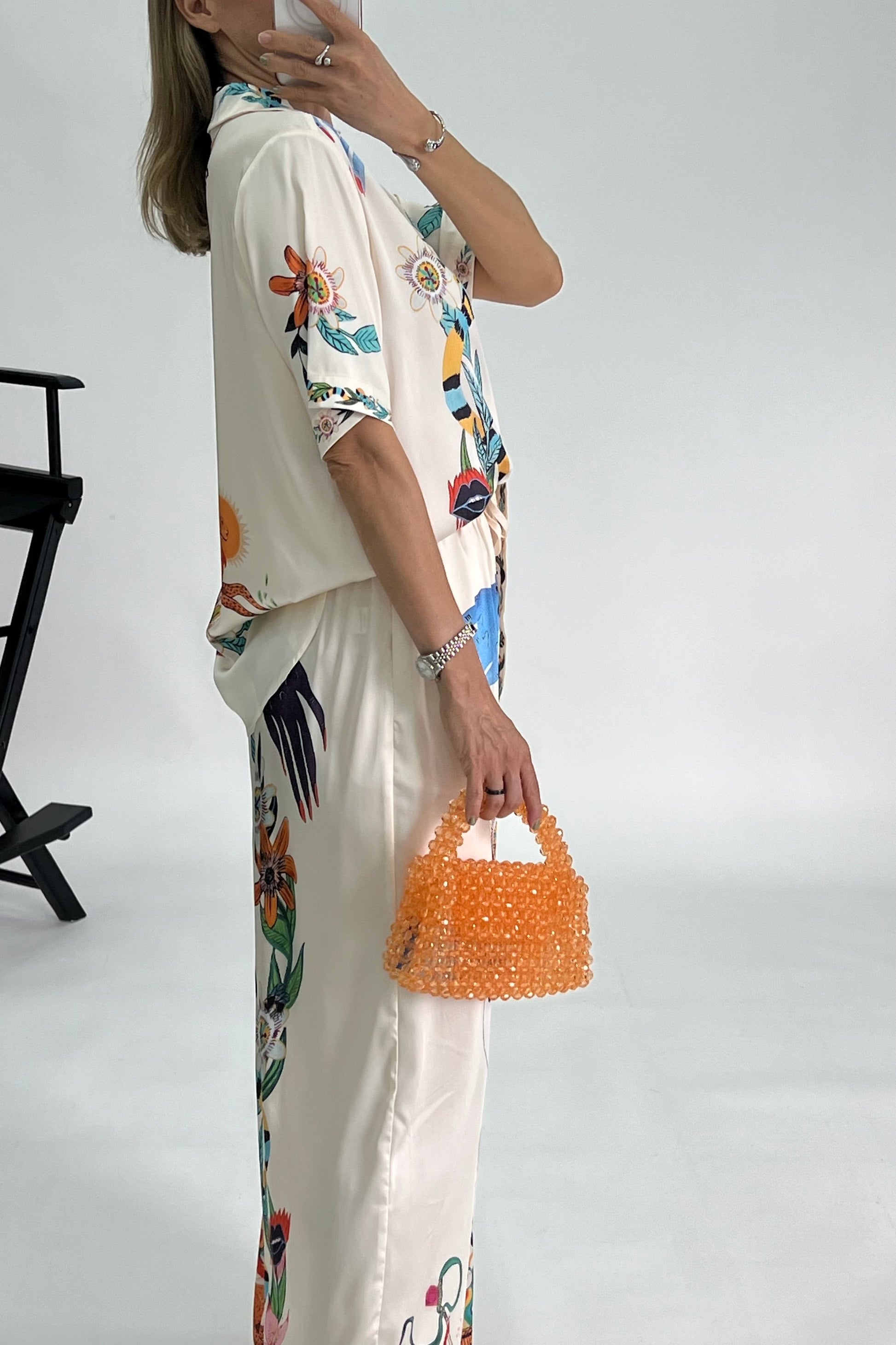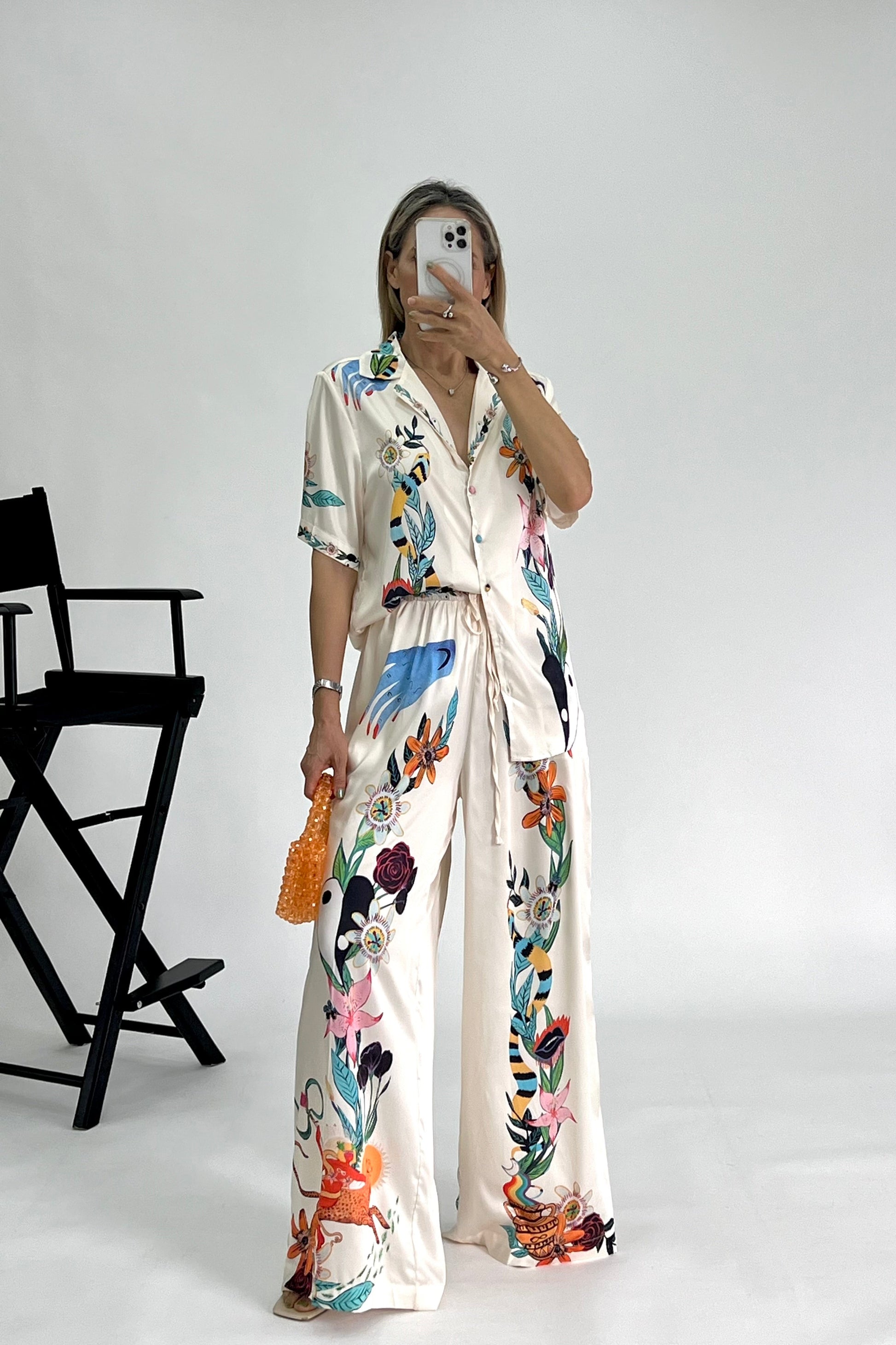 Enamórate de nuestro conjunto de pantalón de pierna ancha y camisa "Shanghai", donde la exclusividad y la elegancia se unen en cada paso. Inspirado en la belleza de los mosaicos tradicionales, este conjunto cuenta con un diseño único con el que serás el centro de todas las miradas vayas donde vayas.