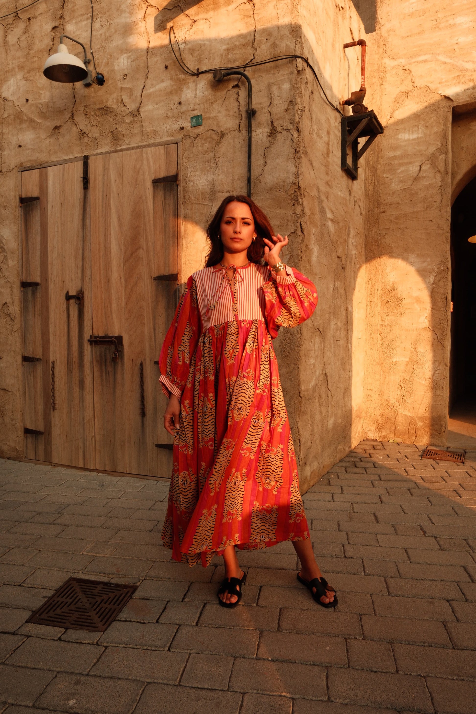 Confeccionado a mano por una pequeña comunidad de mujeres en Jaipur, India, este vestido es una pieza única y especial, cargada de historia, dedicación y alma.